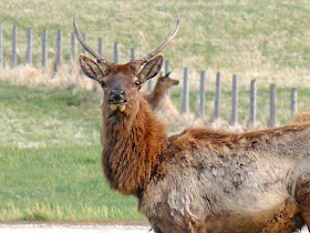 As always, we've taken the time to do some exploring. We drove over the Bitterroots for lunch at one of our favorite places, the Lochsa Lodge. On the way back, we stopped at the Lolo Pass visitor center, where the snow has really piled up - and this is only at an elevation of 5200'. This is the time of year when the elk congregate into large herds and in the early evening can be seen on fields and pasture. Just a few miles down from the refuge, we came upon a large herd, seemingly relaxed and comfortable around people. I was able to walk up to the edge of the field and get this picture of a young bull. Soon, they'll disappear into the mountains to escape the heat and mate,