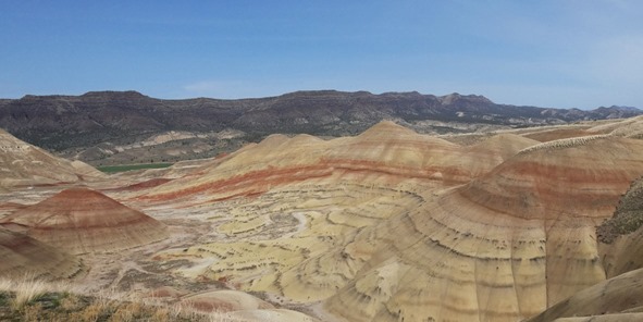 The John Day Fossil Beds National Monument covers a huge area of North-central Oregon and has three separate “units”, one of which is a 2 hour drive from the visitor center. It’s not a place where you can wander around picking up fossils, but an area where millions of years of floods/volcanoes/earthquakes have created layers of rock from different periods that contain an amazing amount of plant and animal fossils. The visitor center was very nice, and had an area where you could watch as fossils were being cleaned and examined. There was also a theater where we watched a very good film that described how the landscape had changed over millions of years and how the diversity of fossils from so many periods make this area special.